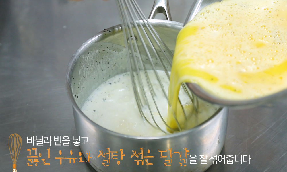 4. 바닐라 빈을 넣고 끓인 우유와 설탕 섞은 달걀을 잘 섞어줍니다.