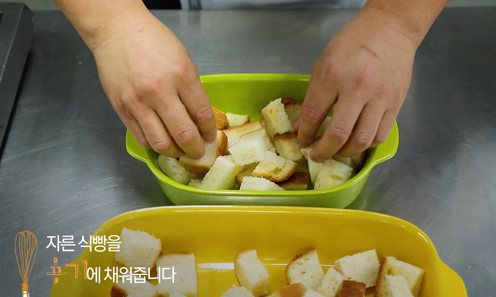 8. 자른 식빵을 용기에 가득 채워주세요.