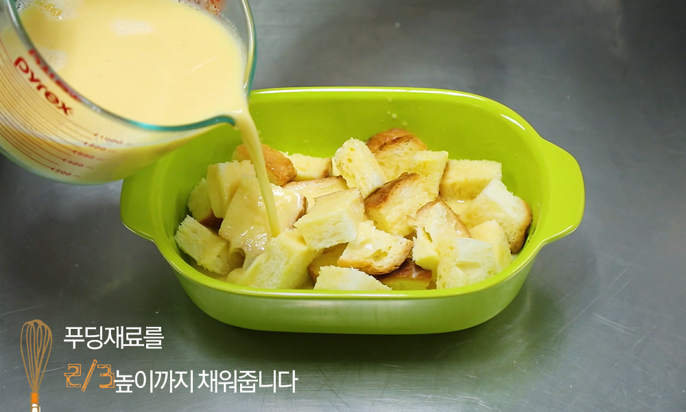 9. 잘 식은 푸딩 재료를 용기의 2/3 높이까지 채워줍니다.