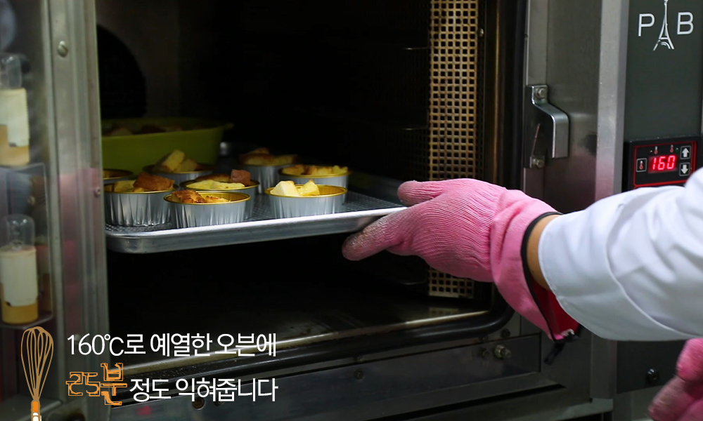 10. 160℃로 예열한 오븐에 25분 정도 익혀줍니다. 푸딩 재료가 흐르지 않고 푸딩처럼 부드럽게 굳으면 꺼내주세요! 조금 덜 익었다면 같은 온도에서 3~5분 정도 더 익혀주세요.