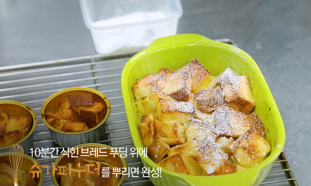 11. 잘 익은 브레드 푸딩을 약 10분 간 상온에서 식힌 뒤 슈가파우더를 뿌리면 완성!