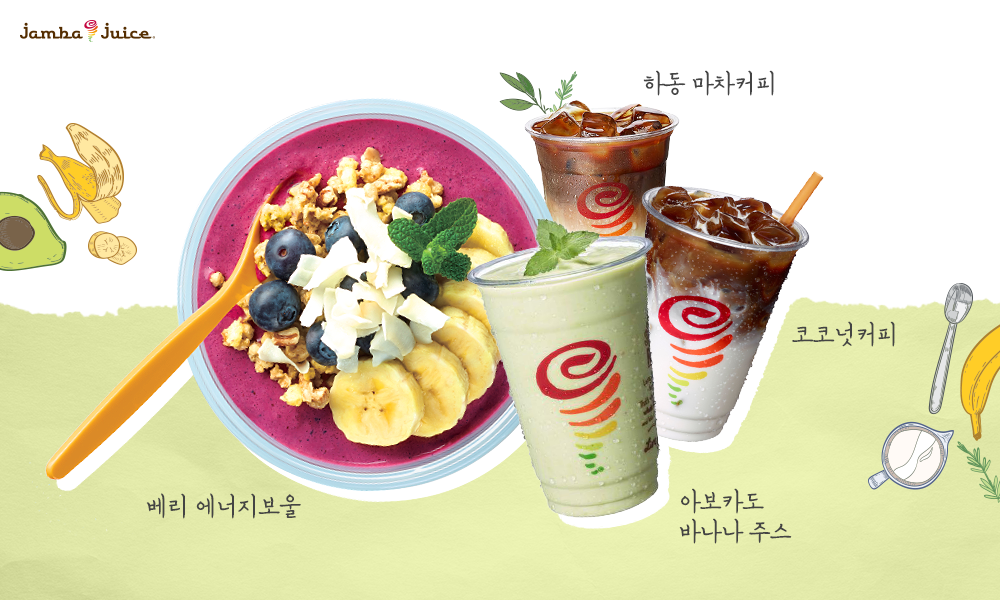 잠바주스에서는 천연과일의 과즙과 함께 상쾌한 하루를 시작할 수 있습니다. 과일 블렌딩에 그래놀라, 생과일 토핑 등 우리 몸에 필요한 영양소를 고르게 제공합니다. 식사 대용으로도 손색 없는 에너지보울, 콜드브루 커피에 100% 식물성 코코넛밀크를 넣은 건강한 코코넛커피, 생아보카도와 바나나를 블렌딩해 고소함 가득한 아보카도 바나나 주스, 스페셜티 커피 원두로 만든 에스프레소와 하동 말차, 우유가 어우러져 이색적인 풍미를 가진 하동 마차커피를 만나볼 수 있습니다. 잠바주스는 모닝제품 프로모션도 진행하고 있는데요. 4월 30일까지는 한끼가 든든한 에너지보울을 3,900원에 만나보실 수 있으며, 지속적으로 잠바주스만의 건강한 제품을 제안할 예정입니다.
