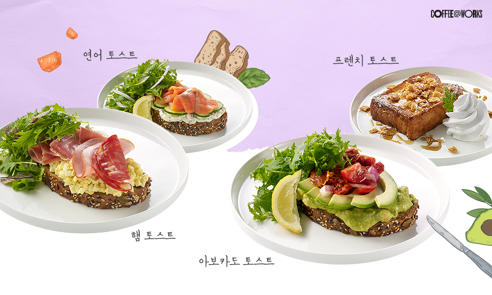 오픈 토스트는 스페셜티 커피와 함께 즐길 수 있는 커피앳웍스 시그니처푸드입니다. 최상급 재료로 만드는 오픈 토스트는 통밀 브레드에 병아리 콩을 곁들인 아보카도 과카몰리와 토마토 살사를 올린 아보카도 토스트, 통밀 브레드에 머스타드를 버무린 계란을 올리고 프로슈토햄, 로인햄, 초리조를 곁들인 햄 토스트, 통밀 브레드에 크림치즈를 듬뿍 바르고 절인 오이, 훈제 연어를 올린 제품인 연어 토스트, 프렌치토스트에 시나몬, 골든 시럽, 생크림, 쿠키 크럼블을 올린 프렌치토스트까지 총 4종으로 구성되어 있습니다. 자신의 입맛에 맞춰 가볍고 든든한 아침 식사를 해보는 건 어떨까요?