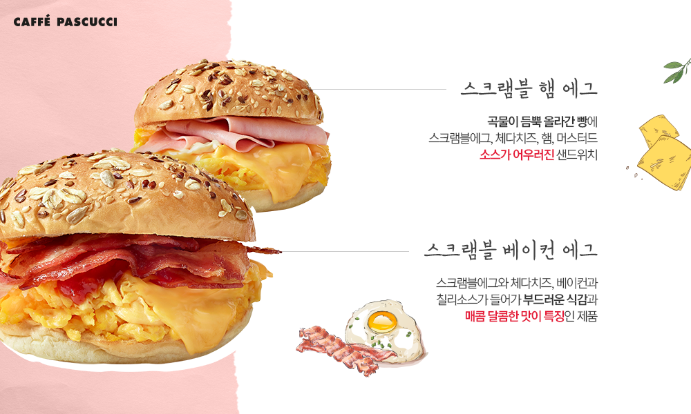 파스쿠찌에서 아침 식사를 책임져 줄 샌드위치를 출시했습니다. 스크램블 햄 에그와 스크램블 베이컨 에그 2종으로 고단백의 스크램블에그를 활용한 것이 특징입니다. 스크램블 햄 에그는 곡물이 듬뿍 올라간 빵에 스크램블에그, 체다치즈, 햄, 머스터드 소스가 어우러진 샌드위치이며 스크램블 베이컨 에그는 스크램블에그와 체다치즈, 베이컨, 칠리소스가 들어가 부드러운 식감과 매콤 달콤한 맛이 특징인 제품입니다. 모닝세트는 오픈 시간(매장별로 상이)부터 오전 10시까지 운영하며 단품으로 구매 시 4,600원, 커피와 함께 세트 메뉴로 구매할 경우 6,000원에 판매 중입니다.