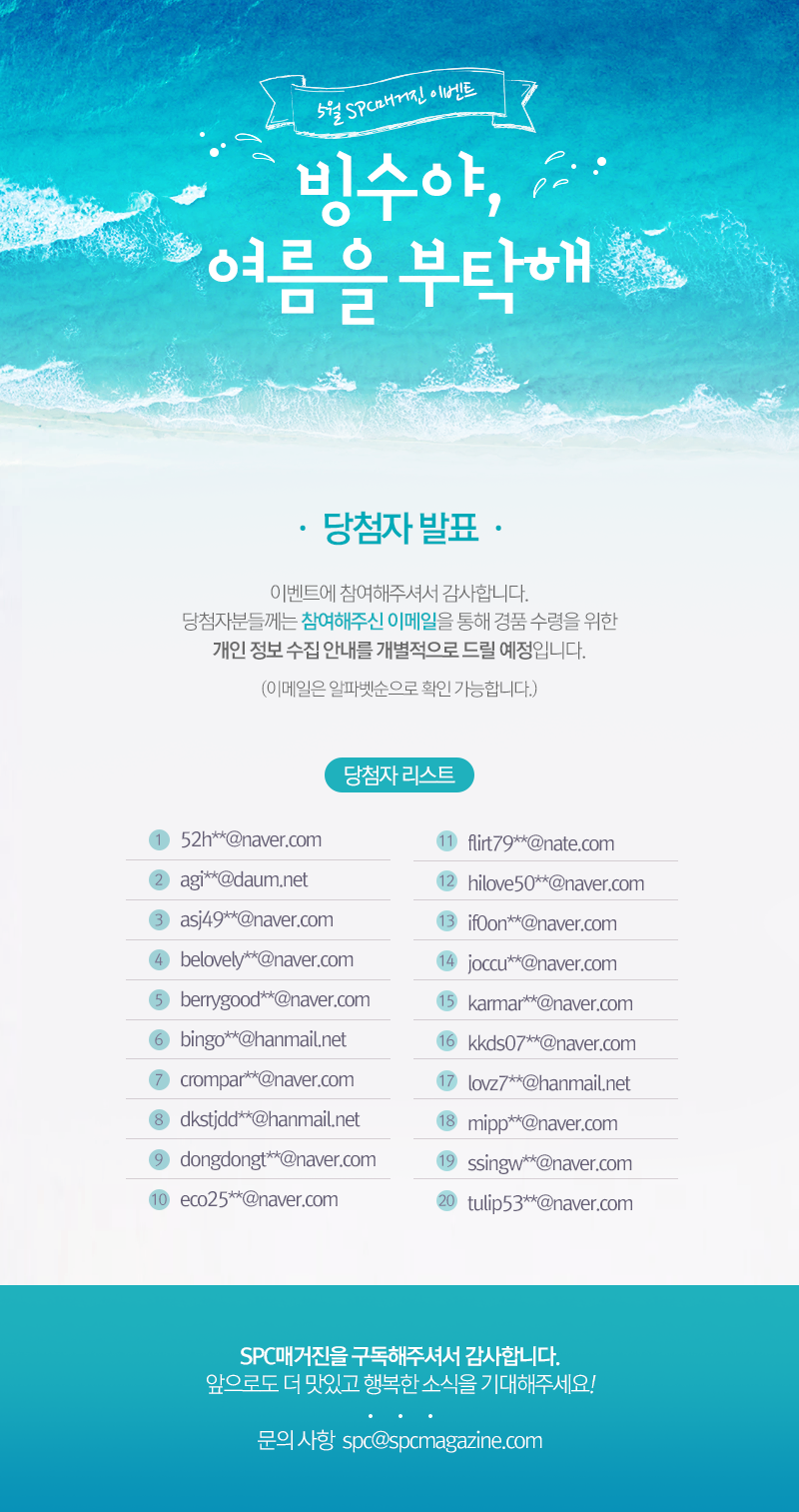 함께 보기 좋은 글 10월 SPC매거진 이벤트 당첨자 발표어쩌다 발견한 설문 10월 SPC매거진 이벤트 당첨자 발표설문왕 9월 SPC매거진 이벤트 당첨자 발표풍성한 한가위 설문하고 경품받자! Tags: 당첨자발표이벤트빙수야여름을부탁해Post navigationPreviousPrevious post:북미정상회담 프레스센터 파리바게뜨 부스 운영NextNext post:배스킨라빈스, 체리쥬빌레 31주년 기념 파티