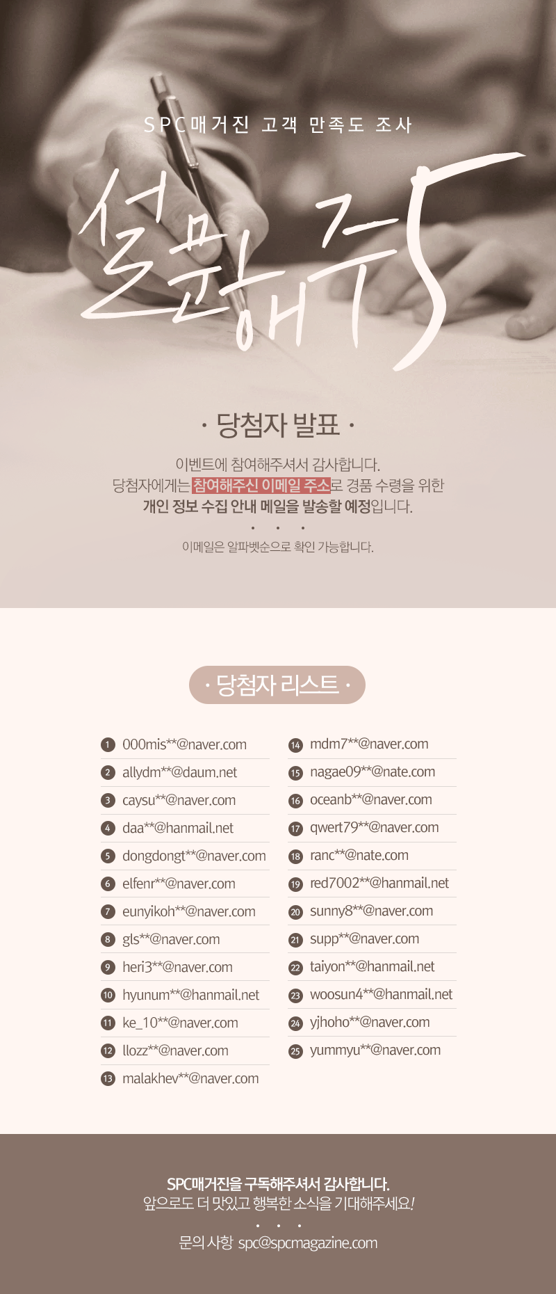 함께 보기 좋은 글 8월 SPC매거진 이벤트 ‘당첨자 발표’전지적 의견 시점 9월 SPC매거진 이벤트 ‘당첨자 발표’전지적 의견 시점 Ⅱ 10월 SPC매거진 이벤트 ‘당첨자 발표’지금 설문하러 갑니다 Tags: 설문해주5당첨자 발표Post navigationPreviousPrevious post:‘토이 스토리_우산’ 프로모션 실시NextNext post:눈으로 먼저 먹는 ‘딸기라떼꽃빙수’ 출시